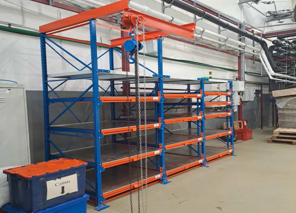 Стеллажи для хранения штамповой оснастки, инструмента и других предметов, применяются полки частичного выдвижения. Используется механизм, который защищает от одновременного выдвижения полок, что делает использование стеллажей безопасным и удобным. Конструкция с талью.