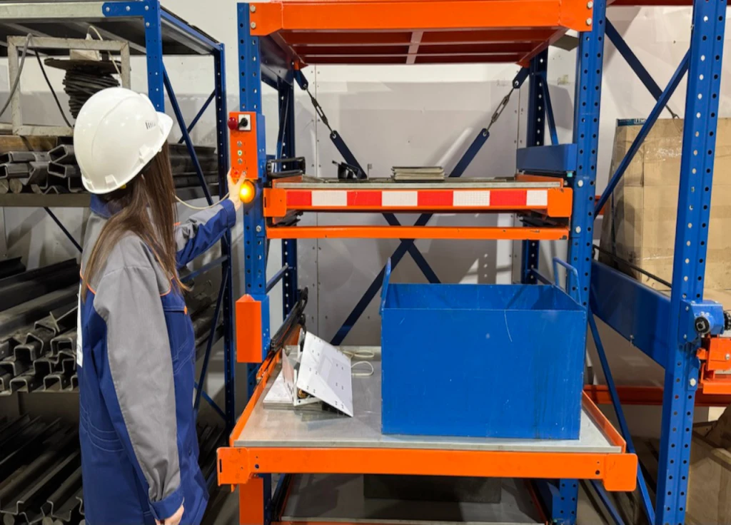 Выдвижные полки оснащаются лотками, которые обеспечивают удобное перемещение грузов в зоне комплектовки.