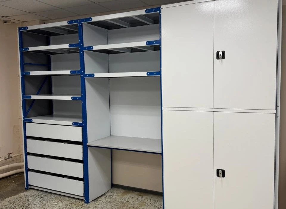 Стеллажные комплексы с ящиками, дверями и рабочим местом — это идеальное решение для организации хранения и работы с мелкими предметами на складе, в цехе. Они представляют собой эргономичную систему хранения, которая обеспечивает быстрый и удобный доступ к необходимым инструментам или деталям.